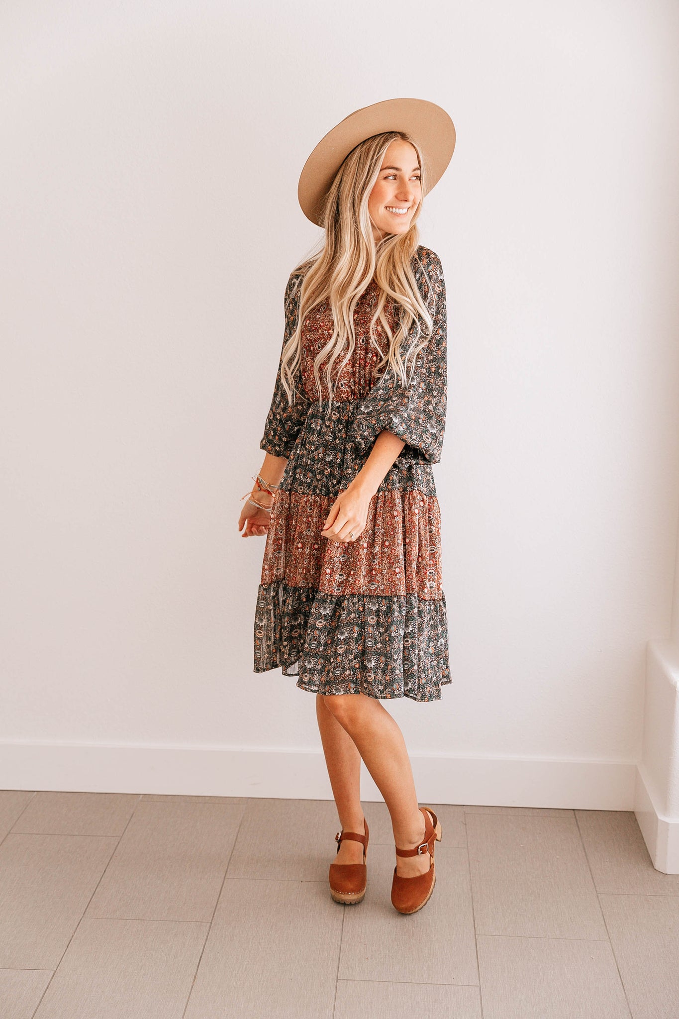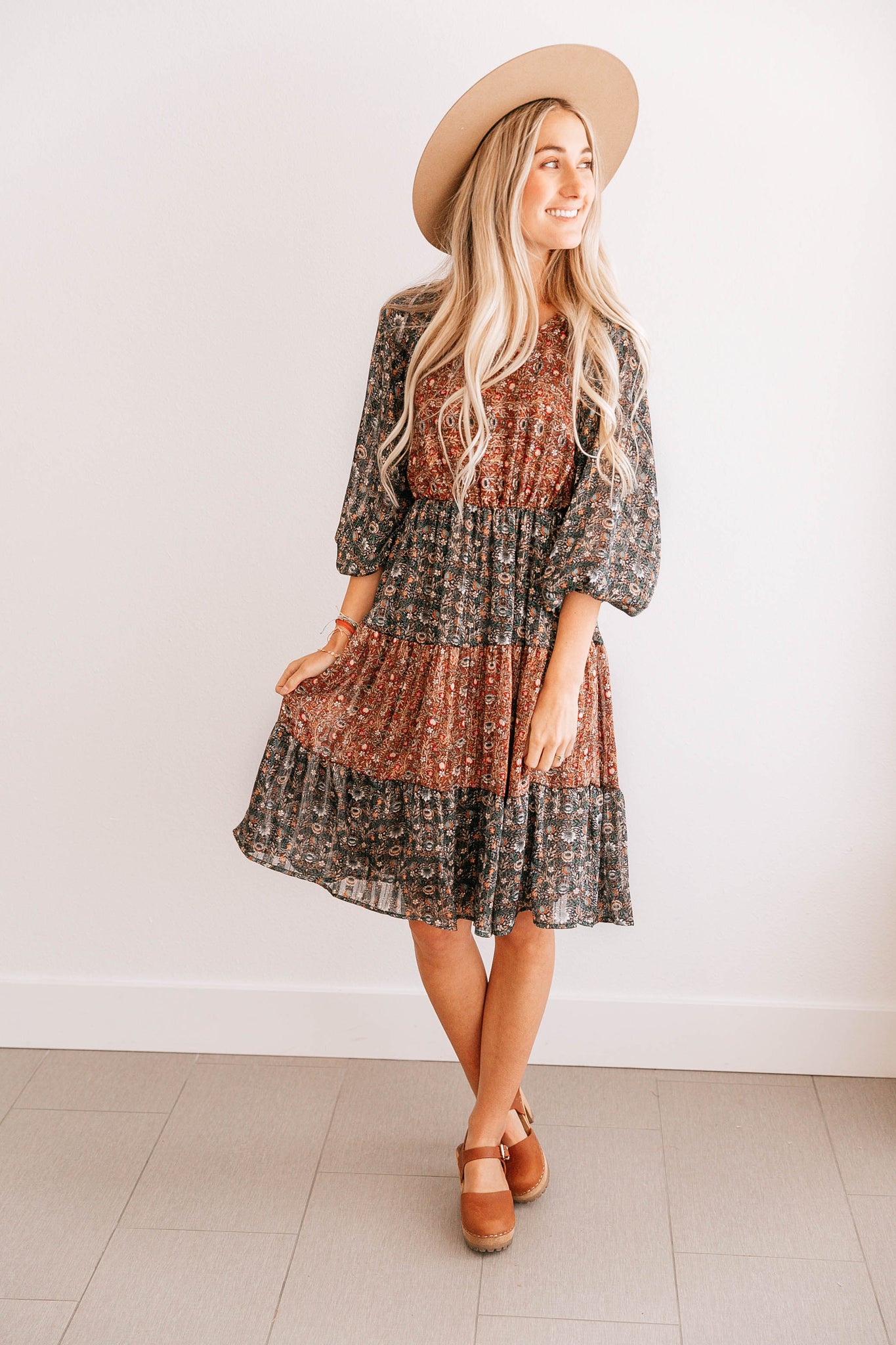 This Puff Sleeve Tiered A-Line Dress features a dainty floral pattern amongst alternating colored tiers, and elastic wrists with a dainty bubble sleeve. It's the perfect dress for just about anyone or anything!